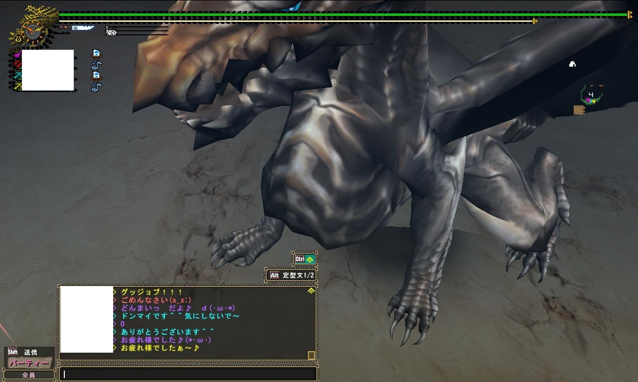 使ってみた感想? ものすごーーーーく便利です>< 持続時間が増えるだけなんだけどもなかなかいいですわ~ 自分が動く時間に余裕あるし待ち伏せ→弱って移動のあたりで効果が切れるくらいが理想ですな メモにもあるとおり濃血はめんどくさい+PTが人気無さ杉なので全部祭りPで交換しちゃいました もったいないけど人集める時間と揃うまでの回数を考えると安い方だと思うんだ・・・ ポイントあとちょい残ってるけど何に使うか迷ってる(´・ω・`) 剛種武器の素材に何かいるのか調べておこうかな・・・。 その後、団員とチケティガ行ってきたんだけど、ティガ自体3戦目であまり慣れていないので最初は冷や冷やしながら戦っていましたが、最近作成完了したシルアカ亜種がかなり便利ですなぁ 亜種なので匠珠がないと審判は発動しないんだけど、頭装備を自由にできるのでSP珠を入れ替えて汎用性を出しています そのうち頭も完成させるけどまぁいまはいいんじゃないかな・・なんとかなってるしw ティガとの戦い方で気づいた事。 不用意に近づかない、変に止まったら離れる、もしくは緊急回避。 最初の罠ハメの位置をしっかり覚える。 んで最後の狩りで気がついたんだけども3人で頭に乱舞すると、レイアみたいにアォンアォン言って怯むんですわ ただ後ろに飛ぶ?っぽいきがするんで後ろが角になっていないとハメ成立しないかもしれないんだけど それだけで倒せちゃったので結構ありかもしれません 角のあたりに罠置いてうまく内側に顔が行った時に殴りまくるとかね サイズがでかい場合は当てにくいと思うので無理な時もあるけれども、ねぐらに行く道の方ですると少し地面が下がっているのでうまく頭に当てる事ができます コレを利用すればかなりの確立でハメが成功するのでもし機会があればためして見ましょう 凄腕ランクになってから防具作成の目標はとりあえず達成したので、後は予備の音無Gと剛種武器、激運ガチ装備を作る感じにしていこうかな メモメモ 魚類種の濃血→150P×15=2250 |